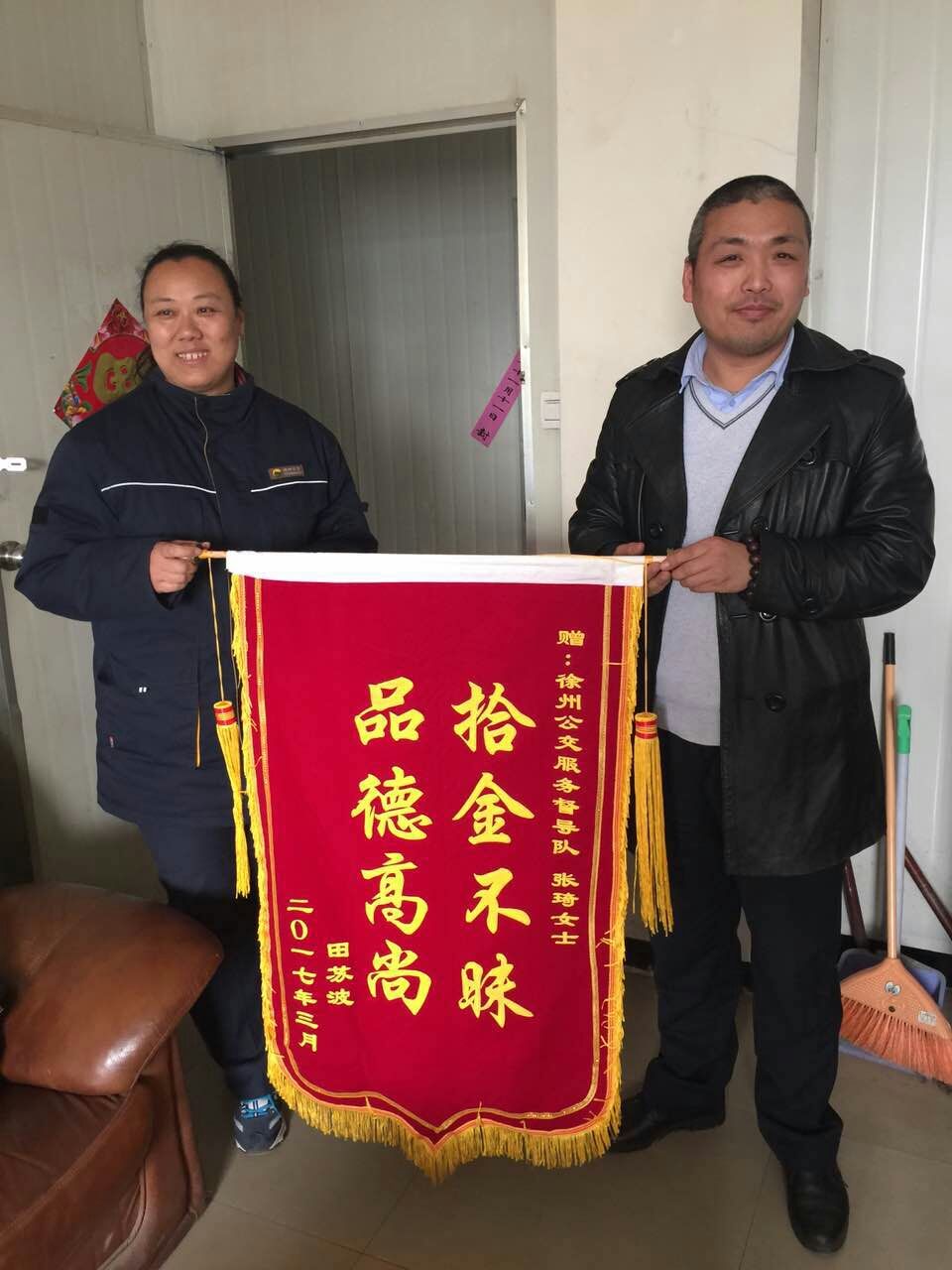 3月29日,正在站臺(tái)執(zhí)勤的督導(dǎo)員張琦撿到乘客掉落的公文包,經(jīng)查看發(fā)現(xiàn)包內(nèi)有蘋果筆記本一臺(tái)和一個(gè)錢包,但并沒(méi)有找到皮包主人的聯(lián)系方式。張琦把包放在了調(diào)度室等待失主來(lái)認(rèn)領(lǐng),約一小時(shí)后失主匆忙趕來(lái)尋找。失主見(jiàn)到失而復(fù)得的皮包非常激動(dòng),經(jīng)過(guò)詢問(wèn)得知失主姓田在徐州礦業(yè)大學(xué)工作。田先生說(shuō),“電腦里存有非常重要的資料和聯(lián)系方式,丟包之后萬(wàn)分焦急,真心感謝公交督導(dǎo)員?!彪S即從錢包里拿出400元錢塞給張琦作為答謝,張琦表示:“路不拾遺本就是自己的義務(wù),作為站臺(tái)督導(dǎo)員經(jīng)常會(huì)在站臺(tái)撿到乘客掉落的物品,不管東西貴重與否我們都會(huì)幫失主妥善保管等待認(rèn)領(lǐng)?!?/span>3月31日,田先生和他的愛(ài)人送來(lái)錦旗表示感謝!